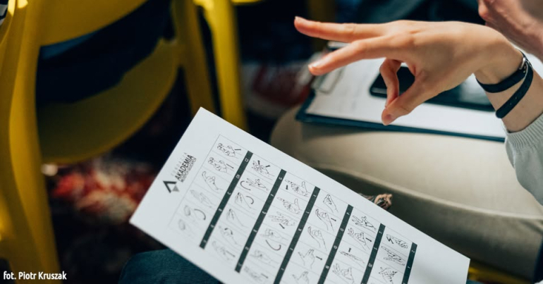 Warsztaty podstaw polskiego języka (PJM) migowego poprowadzi Artur Werbel - tłumacz PJM, który jest jego pierwszym językiem.
