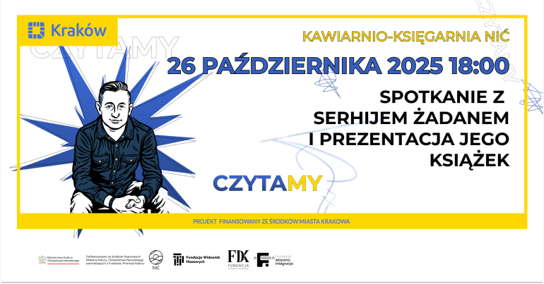 Wydarzenie realizowane przez Fundację Widowisk Masowych w ramach projektu "Spotkania z literaturą ukraińską - CzytaMY" przy wsparciu finansowym Urzędu Miasta Krakowa.Dofinansowano ze środków Ministra Kultury i Dziedzictwa Narodowego pochodzących z Funduszu Promocji Kultury - państwowego funduszu celowego.