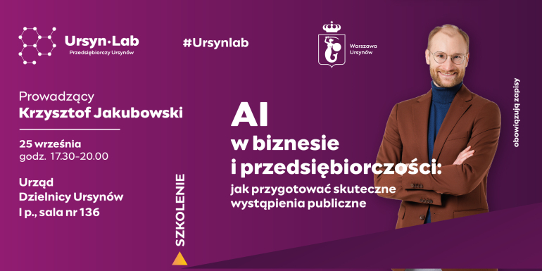 UrsynLab - Przedsiębiorczy Ursynów zaprasza na wydarzenie "AI w biznesie i przedsiębiorczości: jak przygotować skuteczne wystąpienia publiczne" 25 września 17:30-20:00. I p. sala 136.