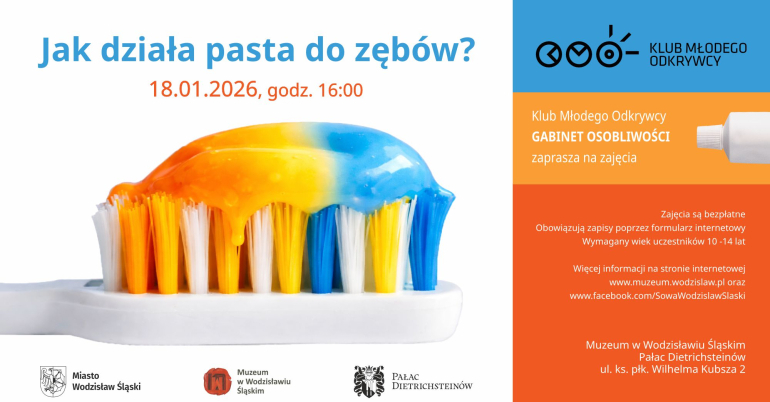 Czy zastanawialiście się kiedyś, jak działa pasta do zębów? Z czego się składa i od kiedy ludzie jej używają? Jeśli ciekawość nie daje Wam spokoju - mamy coś specjalnego! Już 18 stycznia o godz. 16:00 zapraszamy na kolejne spotkanie Klubu Młodego Odkrywcy - Gabinet Osobliwości, które odbędzie się w Muzeum w Wodzisławiu Śląskim - Pałacu Dietrichsteinów.