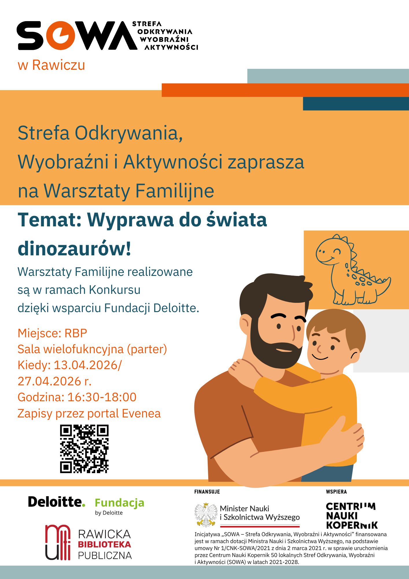 Warsztaty Familijne to interaktywne zajęcia dla dzieci (5-7 lat) i ich opiekunów, podczas których uczestnicy pod czujnym okiem animatorów ze Strefy Odkrywania, Wyobraźni i Aktywności przeprowadzają eksperymenty, wykonują zadania konstrukcyjne, rozwijając przy tym swoją wrodzoną ciekawość i odkrywając świat nauki przez zabawę oraz wspólne działanie. Warsztaty odbywają się w formie całorocznego cyklu, w ramach którego zgłębiamy różnorodne zagadnienia tematyczne, m.in. dźwięk, fluorescencję, dinozaury, iluzje optyczne oraz stany skupienia.