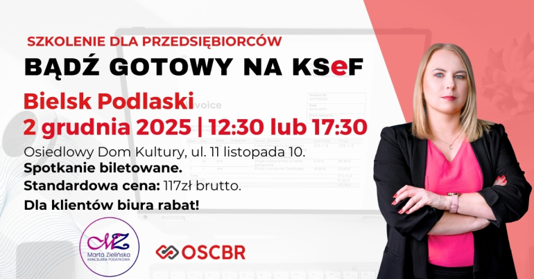 Zapraszamy na organizowane przez Kancelaria Podatkowa Marta Zielińska we współpracy z Ogólnopolską Siecią Certyfikowanych Biur Rachunkowych SZKOLENIE DLA PRZEDSIĘBIORCÓW w ramach programu "Bądź Gotowy na KSeF".
