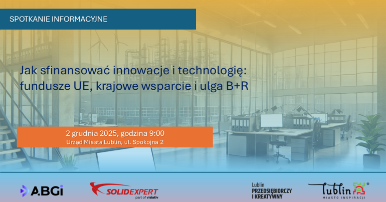 Urząd Miasta Lublin - Wydział Kultury, referat Centrum Przedsiębiorczości i Przemysłów Kreatywnych wraz z firmą ABGI Poland i Solidexpert zapraszają na spotkanie informacyjne pt. "Jak sfinansować innowacje i technologię: fundusze UE, krajowe wsparcie i ulga B+R".