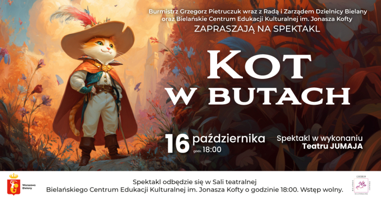 Bielańskie Centrum Edukacji Kulturalnej zaprasza na spektakl "Kot w butach" w wykonaniu teatru Jumaja.