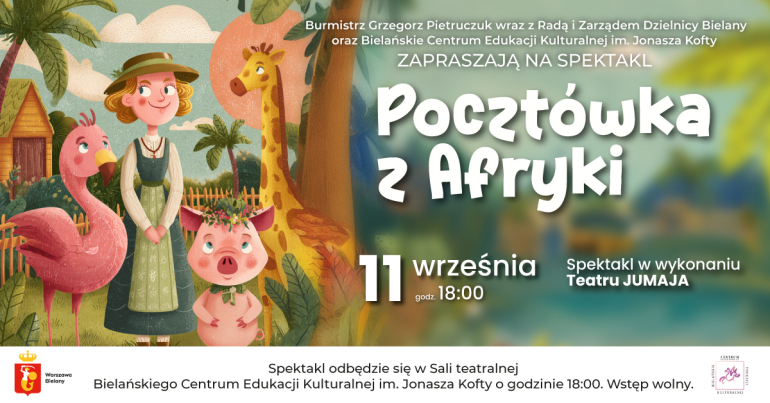 Już 11 września o godz. 18:00 zapraszamy Was do sali teatralnej BCEK na bajkowe przedstawienie "Pocztówka z Afryki". 🦩🐷