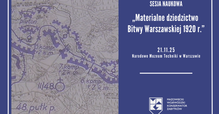 Mazowiecki Wojewódzki Konserwator Zabytków oraz Narodowe Muzeum Techniki w Warszawie zapraszają do udziału w sesji naukowej pt. "Materialne dziedzictwo Bitwy Warszawskiej 1920 r." przygotowanej z okazji 105 rocznicy bitwy. Sesja odbywa się pod patronatem Muzeum Wojska Polskiego oraz Muzeum Niepodległości w Warszawie.