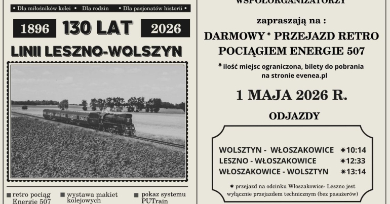 W piątek 1 maja 2026 roku mija 130 lat od otwarcia linii kolejowej łączącej Leszno z Wolsztynem. To wyjątkowa okazja, by wyruszyć w podróż w czasie i uczcić dziedzictwo jednej ze starszych i najbardziej malowniczych tras w Wielkopolsce. W piątek 1. i sobotę 2 maja 2026 r. Włoszakowice zapraszają mieszkańców i miłośników kolei na wielkie święto techniki, historii i lokalnej tożsamości.
