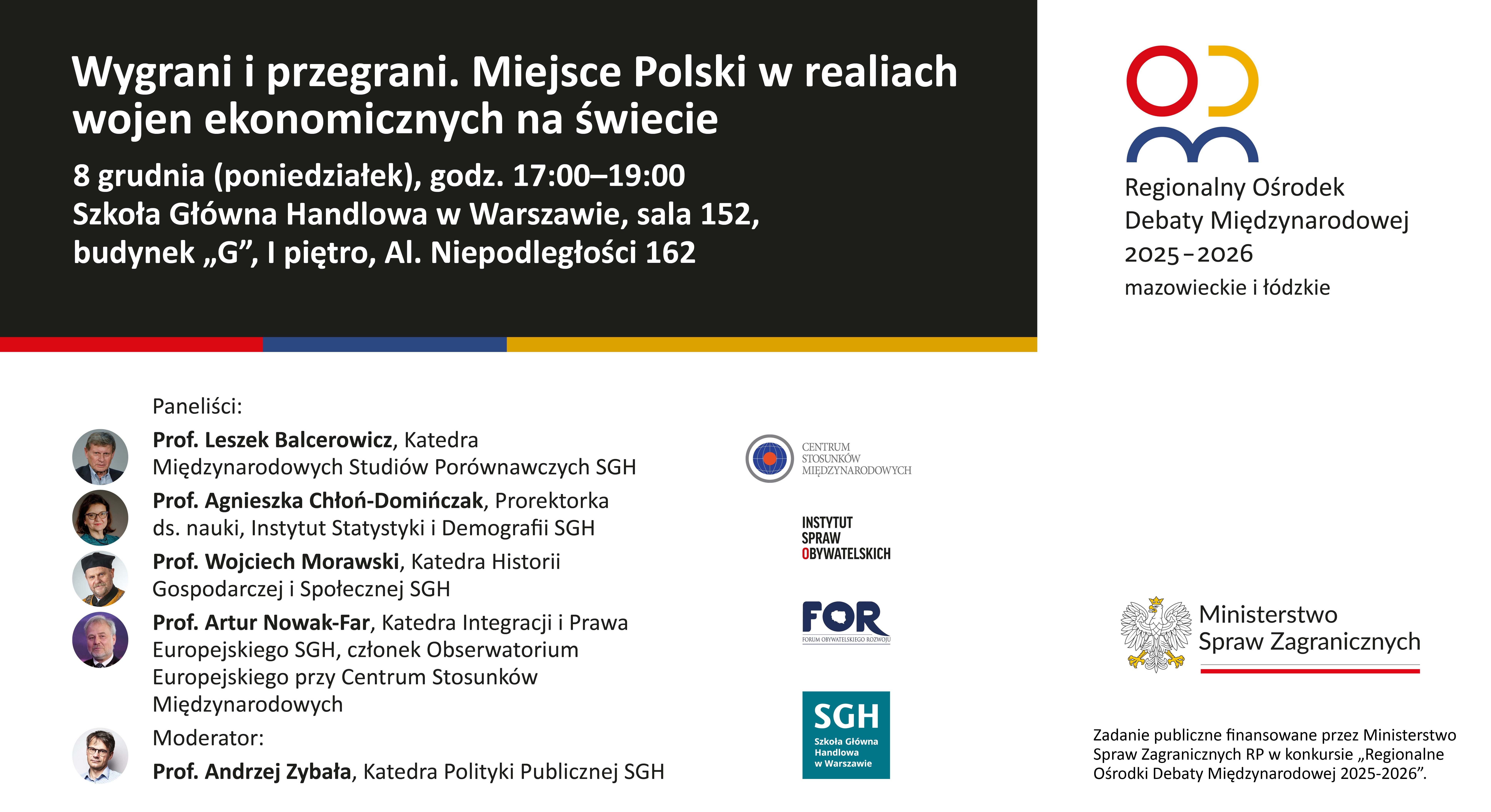 Katedra Polityki Publicznej SGH we współpracy z Regionalnym Ośrodkiem Debaty Międzynarodowej 2025-2026 mazowieckie - łódzkie prowadzonym przez Centrum Stosunków Międzynarodowych i Instytut Spraw Obywatelskich zaprasza na seminarium pt. "Wygrani i przegrani. Miejsce Polski w realiach wojen ekonomicznych na świecie"