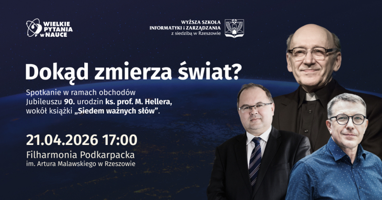 Wyższa Szkoła Informatyki i Zarządzania w Rzeszowie zaprasza na spotkanie w ramach cyklu "Wielkie Pytania w Nauce" pt. "Dokąd zmierza świat?", które odbędzie się 21 kwietnia 2026 r. (wtorek), o godz. 17:00 w Filharmonii Podkarpackiej. Udział w debacie wezmą: ks. prof. Michał Heller, prof. Piotr Kłodkowski oraz dr Jacek Stawiski. Moderatorem spotkania będzie red. Wojciech Bonowicz.