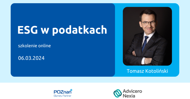 Poznań Biznes Partner oraz firma Advicero Nexia zapraszają na bezpłatne szkolenie online pt. ESG w podatkach.