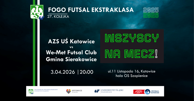 Mecz 27. kolejki FOGO Futsal Ekstraklasy pomiędzy drużynami AZS UŚ Katowice a We-Met Futsal Club Gmina Sierakowice