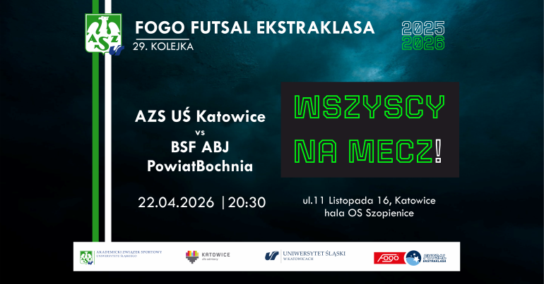Mecz 29. kolejki FOGO Futsal Ekstraklasy pomiędzy drużynami AZS UŚ Katowice a BSF ABJ Powiat Bochnia.