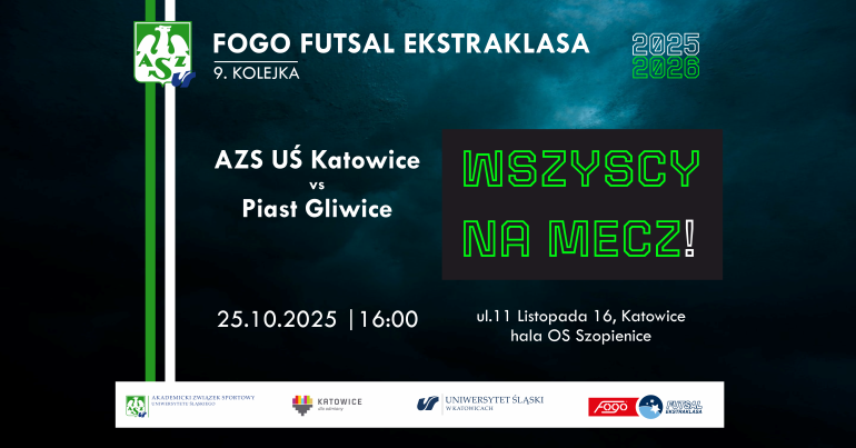 Mecz 9. kolejki FOGO Futsal Ekstraklasy pomiędzy AZS UŚ Katowice a Piastem Gliwice.