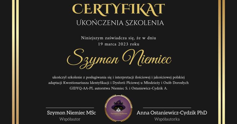 - Uzyskanie certyfikatu uprawniającego do stosowania Kwestionariusza Identyfikacji i Dysforii Płciowej u Osób Dorosłych i Młodzieży (GIDQ).