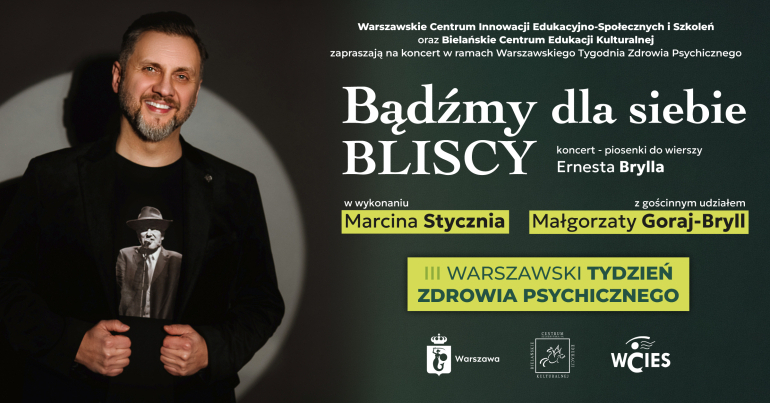 Serdecznie zapraszamy na wyjątkowy koncert "Bądźmy dla siebie bliscy" — poruszające spotkanie z muzyką i poezją, podczas którego usłyszymy piosenki do wierszy Ernesta Brylla w wykonaniu Marcina Stycznia, z gościnnym udziałem Małgorzaty Goraj-Bryll. To wydarzenie pełne wrażliwości, refleksji i emocjonalnego ciepła, idealnie wpisujące się w ideę uważności i troski o wewnętrzny dobrostan.