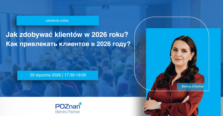Poznań Biznes Partner we współpracy z Mariną Chechet zapraszają na szkolenie online "Jak zdobywać klientów w 2026 roku", skierowane do obywateli Białorusi prowadzących lub planujących prowadzenie działalności gospodarczej w Polsce. Szkolenie odbędzie się 20 stycznia 2026 roku w godzinach 17:30-19:00 i będzie prowadzone w języku rosyjskim.