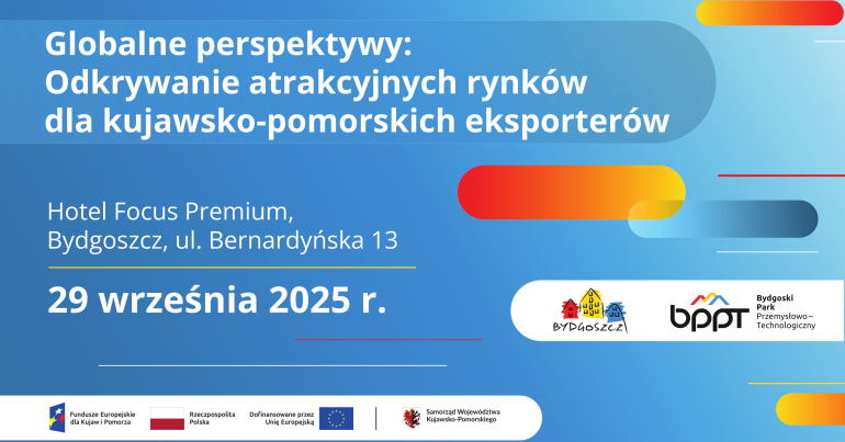 Zapraszamy na konferencję "Globalne perspektywy: odkrywanie atrakcyjnych rynków dla kujawsko-pomorskich eksporterów", podczas której uczestnicy dowiedzą się jak stosować skuteczne strategie negocjacyjne w handlu międzynarodowym, zabezpieczyć płynność finansową za pomocą faktoringu oraz przygotować się do ekspansji na rynek szwedzki. Wydarzenie organizowane jest przez Bydgoski Park Przemysłowo-Technologiczny w ramach projektu "Regionalne Marki na Eksport", współfinansowanego z Europejskiego Funduszu Rozwoju Regionalnego.