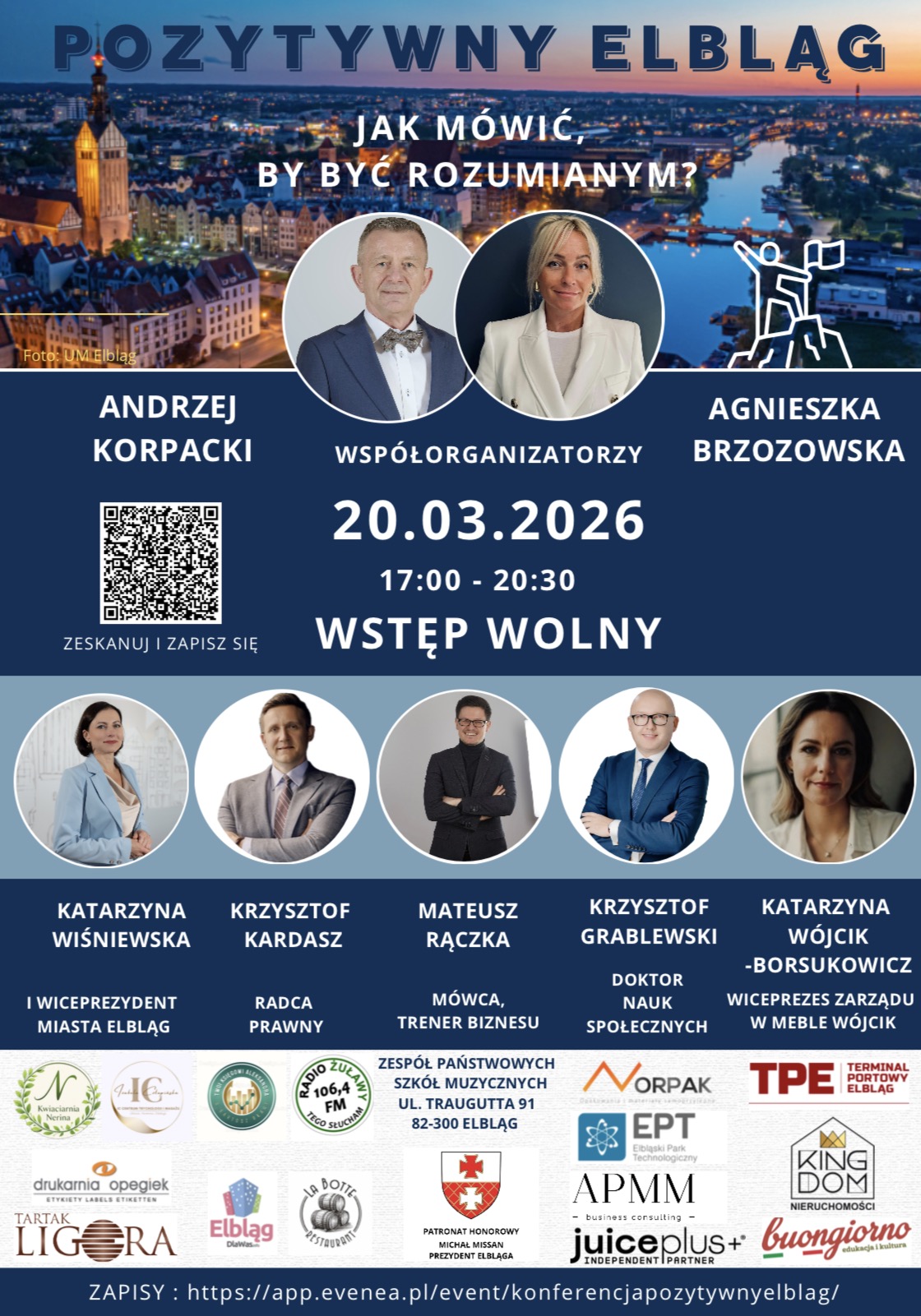 Konferencja jest przestrzenią inspiracji, wymiany doświadczeń i spotkań ludzi, którym bliski jest rozwój osobisty i społeczny. Zapraszamy przedsiębiorców, liderów, specjalistów, edukatorów, osób pracujących z ludźmi oraz wszystkich, którzy chcą rozwijać swoje kompetencje komunikacyjne w pracy i w relacjach. Dołącz do nas i zainspiruj się doświadczeniami ludzi, którzy wiedzą, jak mówić, żeby nas słuchano. Podczas wydarzenia nie zabraknie również networkingu, dobrej energii oraz wartościowych relacji. Ponadto będzie okazja na wspólne świętowanie pierwszej rocznicy inicjatywy Pozytywny Elbląg. Wydarzenie zostało objęte Honorowym Patronatem Michała Missan - Prezydenta Elbląga. Współorganizatorami konferencji są:Andrzej Korpacki - Dyrektor Zespół Państwowych Szkół Muzycznych im. Kazimierza Wiłkomirskiego w Elblągu oraz Agnieszka Brzozowska - organizatorka konferencji Pozytywny Elbląg.