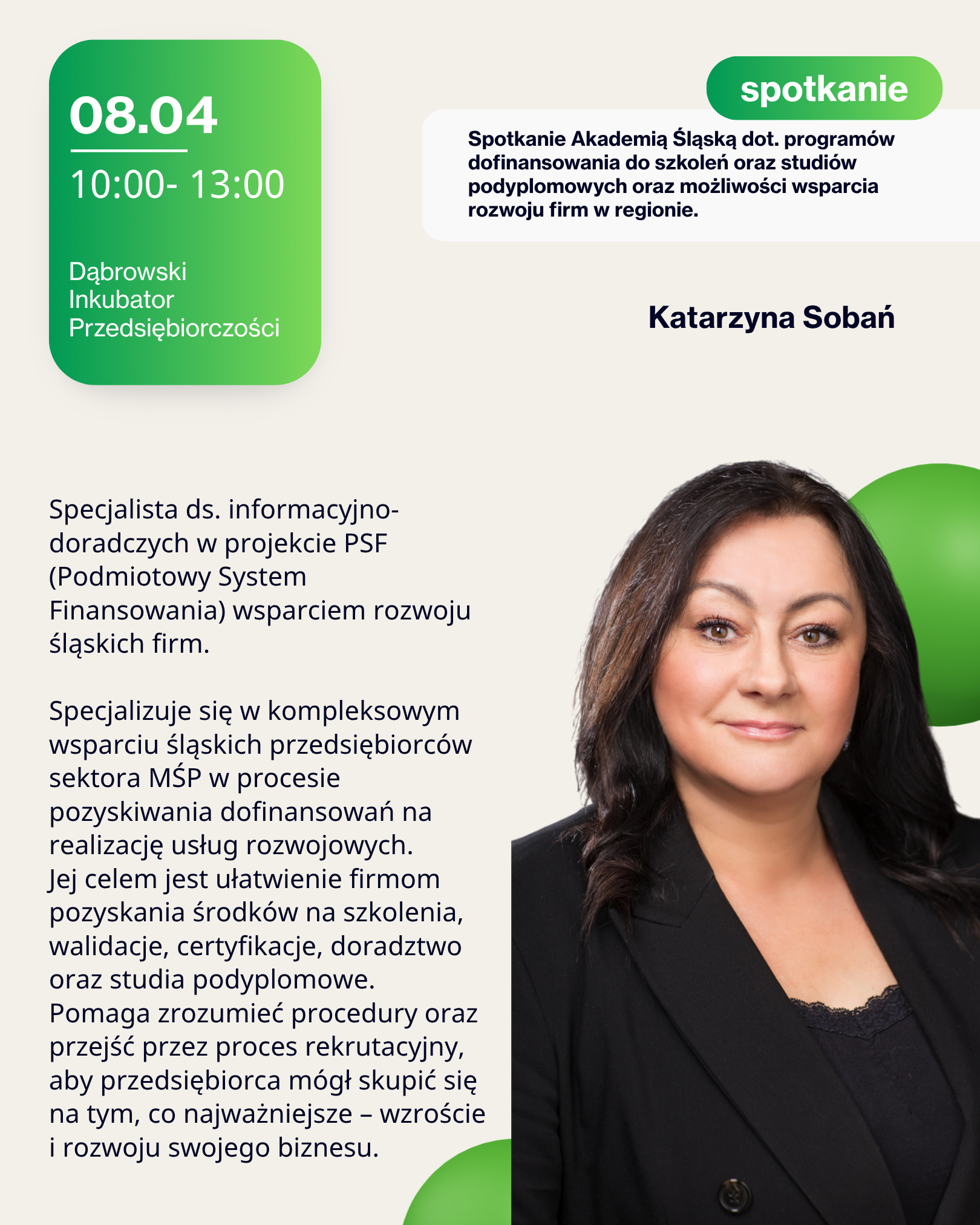 💡 Prowadzisz firmę w Dąbrowie Górniczej lub okolicy? Chcesz zainwestować w rozwój kadr, podnieść kwalifikacje swoich pracowników lub sfinansować studia podyplomowe? Zgłoś się na bezpłatne konsultacje indywidualne!