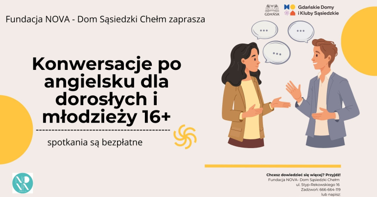 Fundacja NOVA Dom Sąsiedzki Chełm zaprasza dorosłych oraz młodzież na swobodne spotkania konwersacyjne w języku angielskim. To doskonała okazja, aby poćwiczyć mówienie w miłej, luźnej atmosferze, bez stresu i szkolnych schematów.
