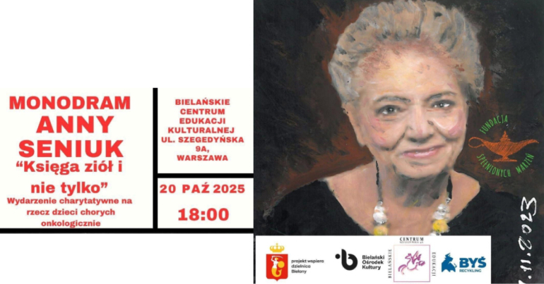 Monodram Anny Seniuk "Księga ziół i nie tylko" 🌿 Serdecznie zapraszamy na wyjątkowe wydarzenie charytatywne na rzecz dzieci chorych onkologicznie, które odbędzie się 📅 20 października 2025 r. (poniedziałek) 🕕 godz. 18:00 📍 w Bielańskim Centrum Edukacji Kulturalnej im. Jonasza Kofty, ul. Szegedyńska 9a W magicznym monodramie Anny Seniuk, jednej z najwybitniejszych polskich aktorek, spotkamy się z ciepłem, refleksją i humorem, a wszystko to w szczytnym celu ❤️