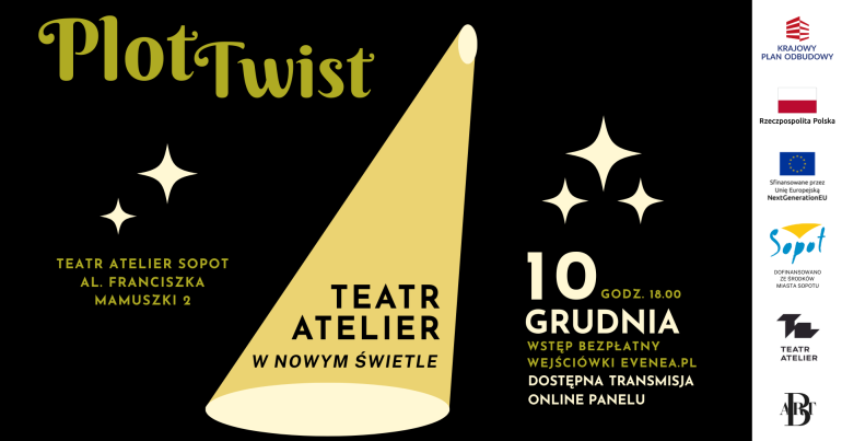 Projekt "Plot twist: Teatr Atelier w nowym świetle" został objęty wsparciem w ramach Krajowego Planu Odbudowy i Zwiększania Odporności w ramach Inwestycji A2.5.1: Program wspierania działalności podmiotów sektora kultury i przemysłów kreatywnych na rzecz stymulowania ich rozwoju (przyznana kwota dotacji: 25 304,00 zł).