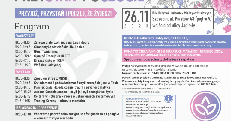 Godz. 10:00 - Otuleni Jogą czyli poranna piękna praktyka z Dominiką Andrzejczak Godz. 11:30 - Gimnastyka Słowiańska (tylko dla kobiet) warsztat niezwykłej praktyki specjalnie dedykowanej ciału kobiecemu z Sonią Mrzygłocką-Pyć Godz. 13:00 - Głos, Twoja moc - warsztaty pracy z głosem prowadzone przez p.profesor Iwonę Wiśniewską -Salamon Godz. 14:30 - Opukać emocje czyli EFT - przepiękna technika uwalniania emocji z Gracjaną Pondo Godz. 16:00 - Drżące ciało w TRE - uwalnianie napięć z ciała z Anią Podlaszewską Godz. 17:15 - Weź tlen, oddychaj wieczorny warsztat oddechowy z Kamilą TylickąPanel Wykładowy: godz. 10:00 Anna Pezold - Zredukuj stres z MBSR godz. 11:30 Iwona Wiśniewska-Salamon - Świadomość i Podświadomość czyli szczęście jest w Tobie godz. 13:00 Ewa Cieesla - Access Consciousness - Szczęśliwe Życie godz. 14:30 Ania Podlaszewska - Pamięć ciała, dziedziczenie traum i psychosomatyka godz. 16:00 - Olga Bruszkowska - Co tam w Polu gra ... rzecz o Ustawieniach Systemowych godz. 17:15 Zbigniew Mielke - Trening Karuny - zdrowie mentalneKoncert relaksacyjny lub medytacja - godzina 18:30 Dla dzieci - strefa warsztatowa równolegle do zajęć dla dorosłych. W przestrzeni relaksacyjnej - masaże, zabiegi, sesje terapii, jedzenie, rękodzieło i inne atrakcje Zakup biletu upoważnia Ciebie do udziału w dwóch wybranych warsztatach (wg dostępności miejsc na nie), w dowolnej ilości wykładów, w koncercie wieczornym lub medytacji, w pokazach masażu, refleksologii, calligraphy healt, do korzystania z usług naszych wystawców (odpłatne i/lub nieodpłatne usługi: masażu, terapii, porad, i inne) |