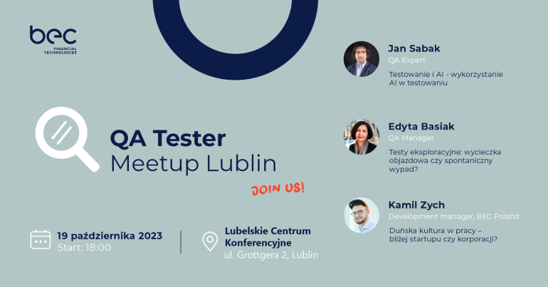 BEC Poland zaprasza na wydarzenie QA Tester Meetup Lublin #2, które odbędzie się 19 października 2023 roku w Lubelskim Centrum Konferencyjnym, ul. Artura Grottgera 2, 20-605 Lublin, (IV. piętro - należy wjechać windą) . Uczestnictwo w spotkaniu jest bezpłatne, wejście za okazaniem biletu, który można pobrać przez Evenea: https://evenea.pl/pl/wydarzenie/qatesterlublin2