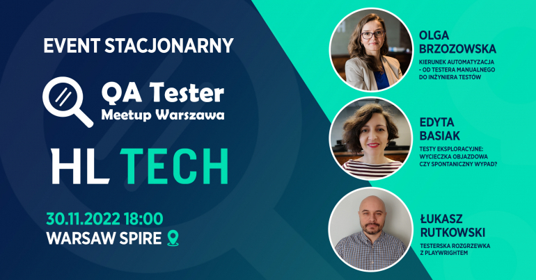 Zapraszamy na wydarzenie QA Tester Meetup Warszawa - listopad 2022, które odbędzie się już 30 listopada 2022 o godzinie 18:00 w siedzibie firmy HL TECH, budynek Warsaw Spire, ul. Plac Europejski 1, pietro 34.