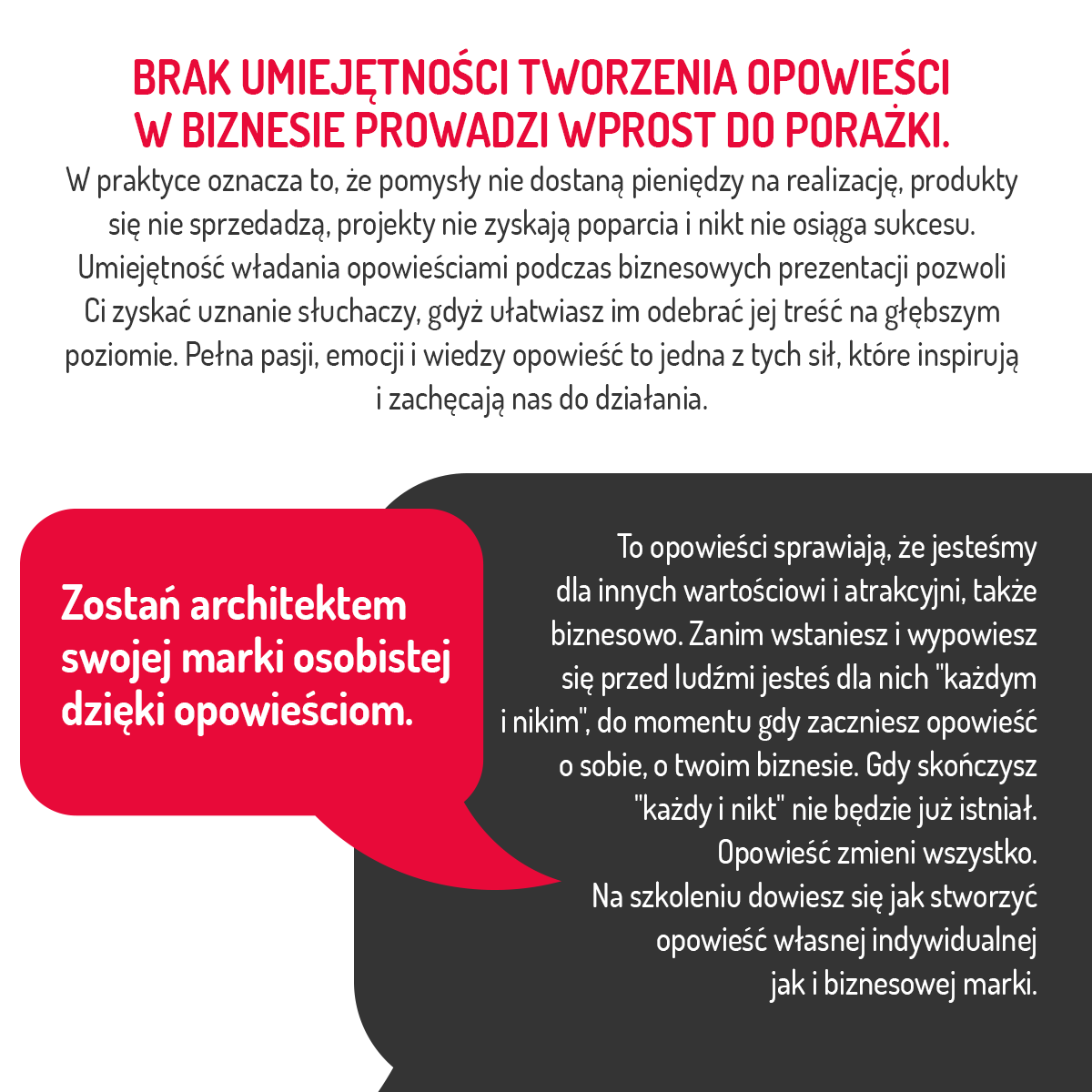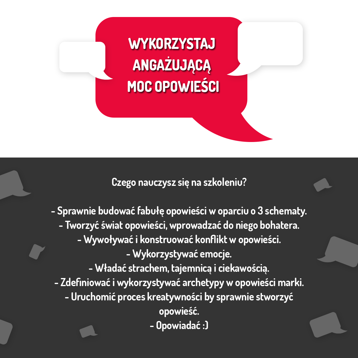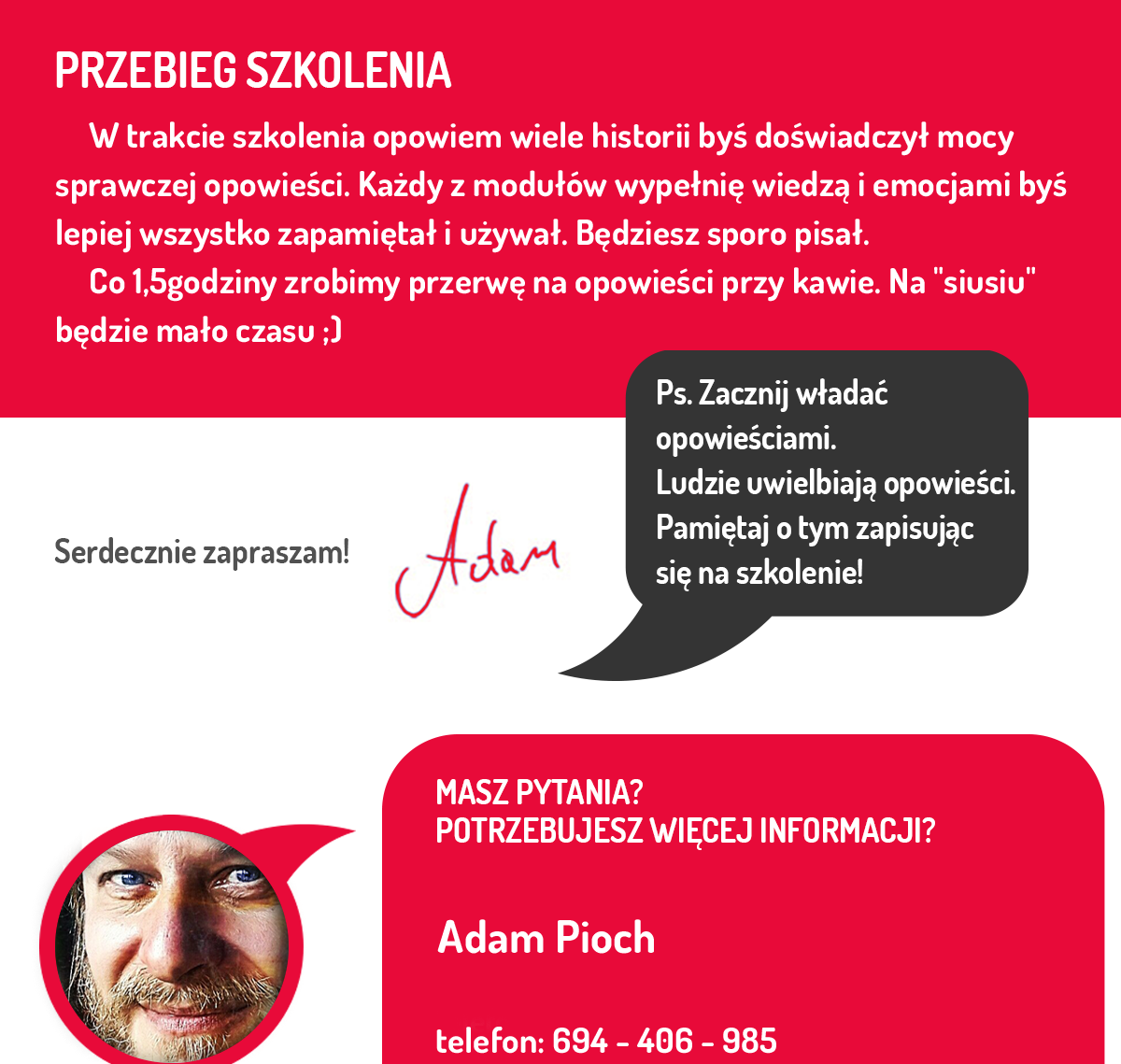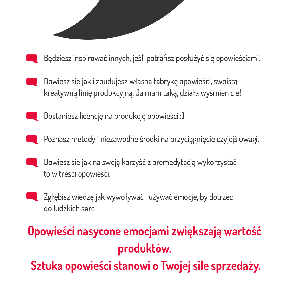 Pierwszy dzień szkolenia: - teoria poziom podstawowy, - wprowadzające ćwiczenia pisarskie, - materiały szkoleniowe. W pierwszym dniu szkolenia poznasz i zastosujesz wiedzę w wersji uproszczonej, idealnej na początek jeśli nie miałeś nigdy kontaktu z storytellingiem. Jeśli jednak uwielbiasz duże porcje wiedzy i chcesz zrobić sporo ćwiczeń zapraszam na wersję dwudniową.