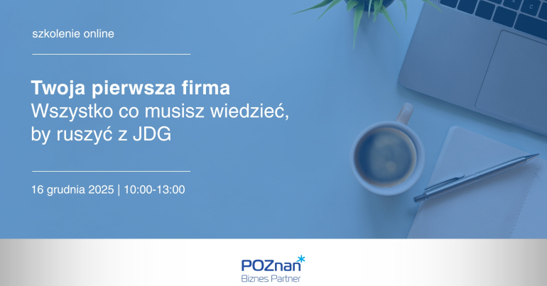 Poznań Biznes Partner zaprasza na bezpłatne szkolenie online pt.: Twoja pierwsza firma. Wszystko, co musisz wiedzieć, by ruszyć z JDG.