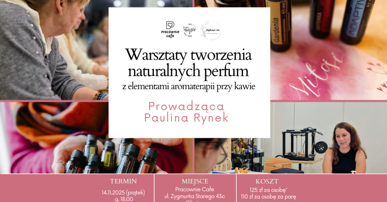 Uczestniczki dowiedzą się, jak prawidłowo korzystać z olejków eterycznych, jak komponować perfumy (nuty: głowy, serca, bazy) oraz stworzą własną, autorską mieszankę wspierającą samopoczucie.