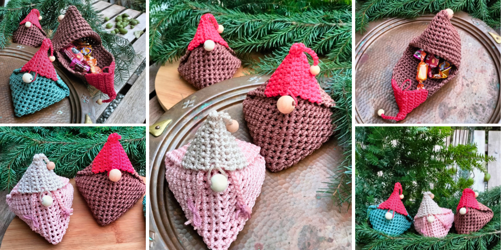 1. Wykonają szydełkowego skrzata, który jest równocześnie "schowkiem" na cukierki, skarby, drobiazgi. Docelowo skrzata można wypełnić miękką apaszką, co zmieni go w przytulankę. Zapraszam do obejrzenia rolki ze skrzatami na moim profilu na Instagramie (@etnobaba).