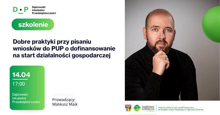 14.04 Dobre praktyki przy pisaniu wniosków do PUP o dofinansowanie na start działalności gospodarczej Prowadzący: Mateusz Maik