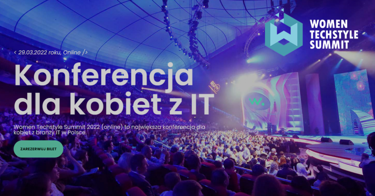 Women TechStyle Summit 2022 (online) to największa polska konferencja poświęcona kobietom w branży IT . W tym roku konferencja odbywa się w dniu 29.03.2022 roku w formie transmisji online. Skierowana jest specjalistek z brażny IT oraz osób, które dopiero chciałyby rozpocząć karierę branży IT. Konferencja zapewnia niesamowite emoje związane z występami niesamowitych prelegentek z wiodących firm IT w Polsce i na świecie. Podczas konferencji na swoich wirtualnych stoiskach zaprezentują się jedynie uznane i innowacyjne firmy informatyczne, których obecność zwiększa rangę wydarzenia. W trakcie trwania konferencji odbędą się Wirtualne Targi Pracy IT, na których interaktywnie nawiążesz kontakt z firmami.