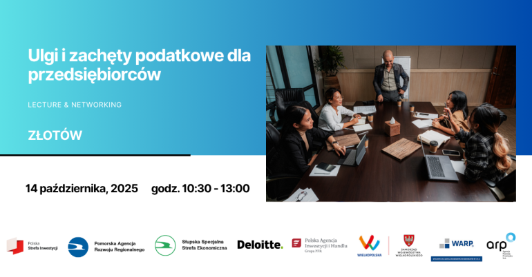 Pomorska Agencja Rozwoju Regionalnego S.A., spółka zarządzająca Słupską Specjalną Strefą Ekonomiczną oraz partnerzy wydarzenia: Deloitte, Agencja Rozwoju Przemysłu S.A. (ARP), Polska Agencja Inwestycji i Handlu (PAiH), Centrum Obsługi Inwestorów i Eksporterów (COIE), Wielkopolska Agencja Rozwoju Przedsiębiorczości Sp. z o.o. Oddział w Pile (WARP) zapraszają na spotkanie dla przedsiębiorców: Ulgi i zachęty podatkowe dla przedsiębiorców, ekspansja zagraniczna.